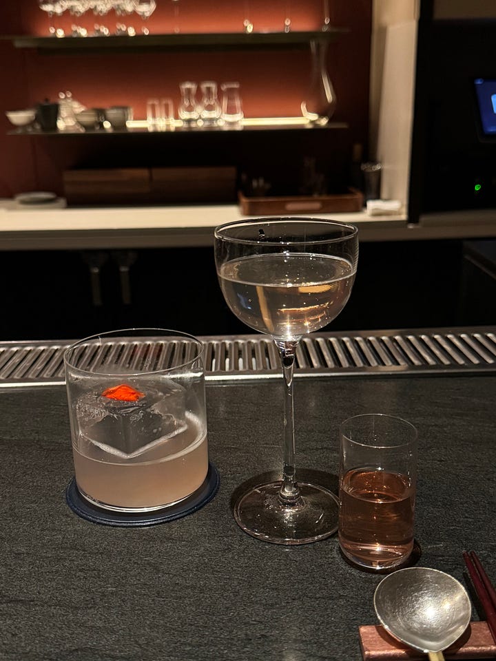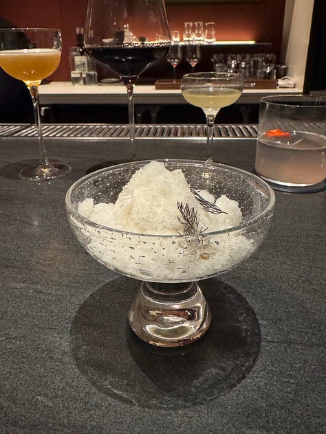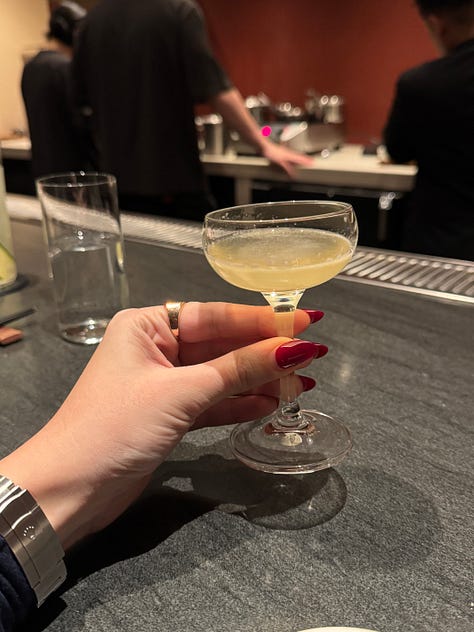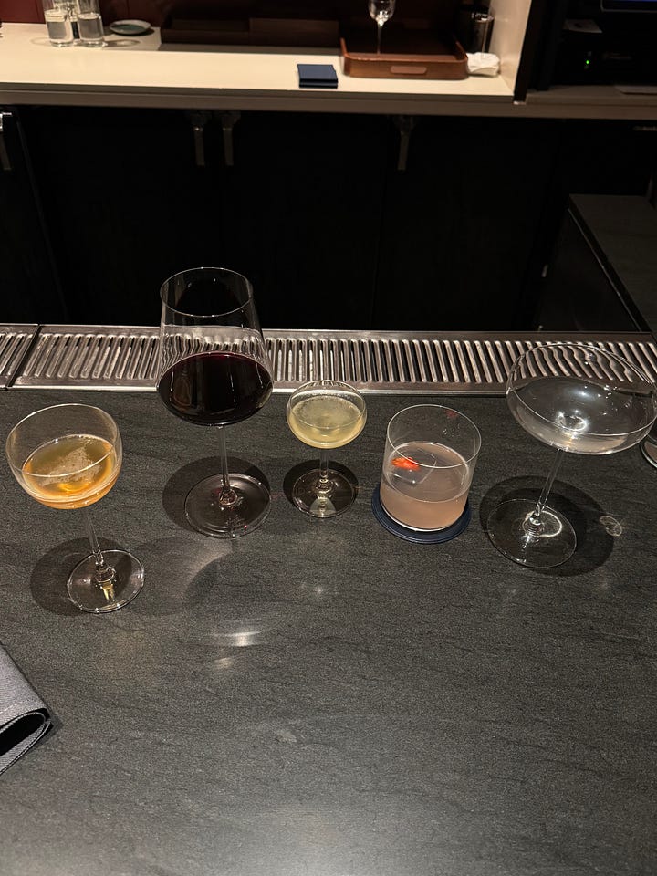 We opted for the bar tasting menu (upstairs) over the chef’s table tasting menu (downstairs). It’s ten courses instead of twelve and runs you $285 per person instead of $385. You pay for the entire thing when you make the reservation, which is great because two months later when our dinner finally rolled around, it felt like it was free! The bar tasting menu also comes with cocktail pairings, which I didn’t think much of, until I was four drinks deep at 9 pm on a Wednesday and struggling to keep up with the drinks as more kept getting brought out.