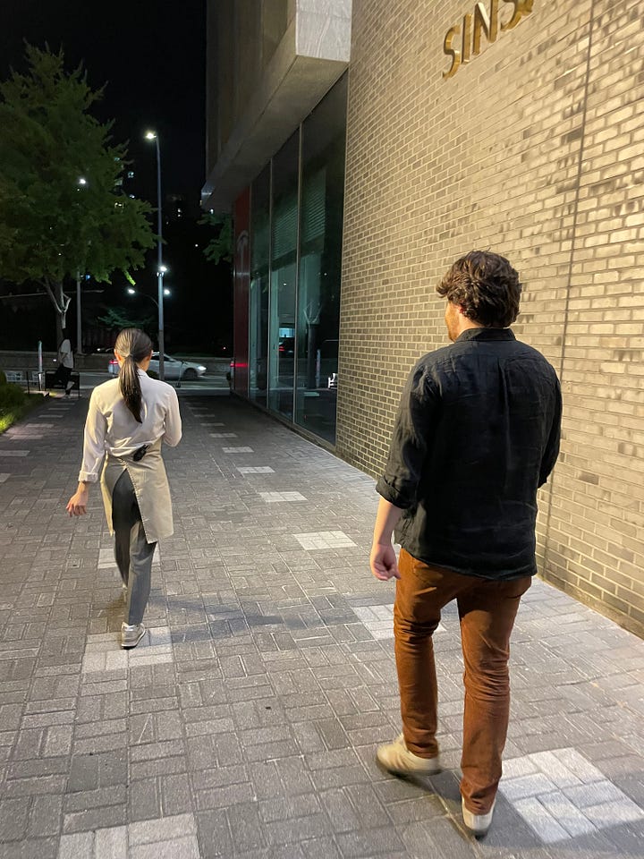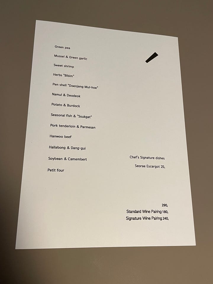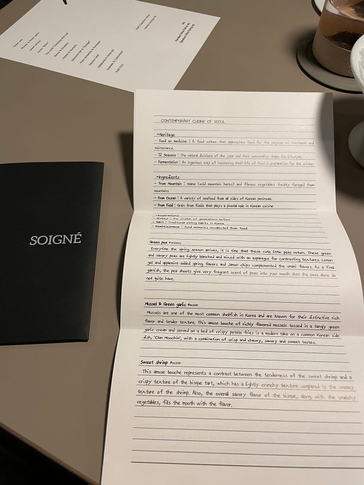 Throughout ten days in Seoul, I often found myself going stir crazy, which is historically something that happened to me on every single Jabberwocks tour, whether in a member’s family home in Connecticut or across the world in Seoul. I anticipated that the feeling would hit me, so I needed to carve out certain moments of solitude in advance. I became particularly enthralled by one restaurant on my friend’s list of Seoul recommendations. She said if I did one fancy dinner anywhere in Korea, it should be at Soigné.