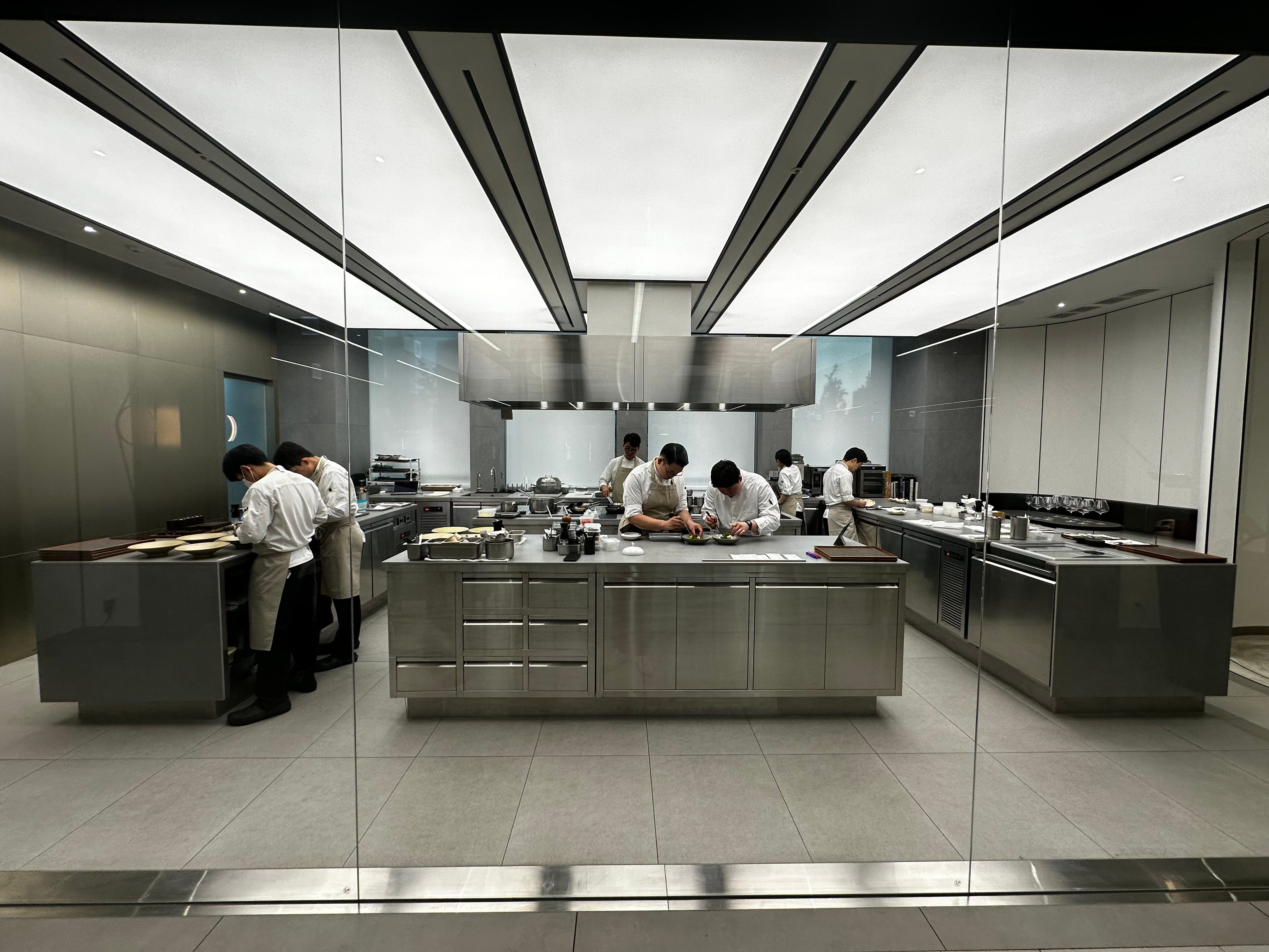 We arrived at the address and found ourselves amidst a complex of office buildings. We were convinced we were in the wrong place, but eventually we found our way into the elevator and an employee guided us through an unassuming corporate hallway through the doors to the restaurant. On our right we passed a glassed-in kitchen that looked more like a medical lab, with chefs scurrying around in matching light grey outfits that actually looked a lot like scrubs.