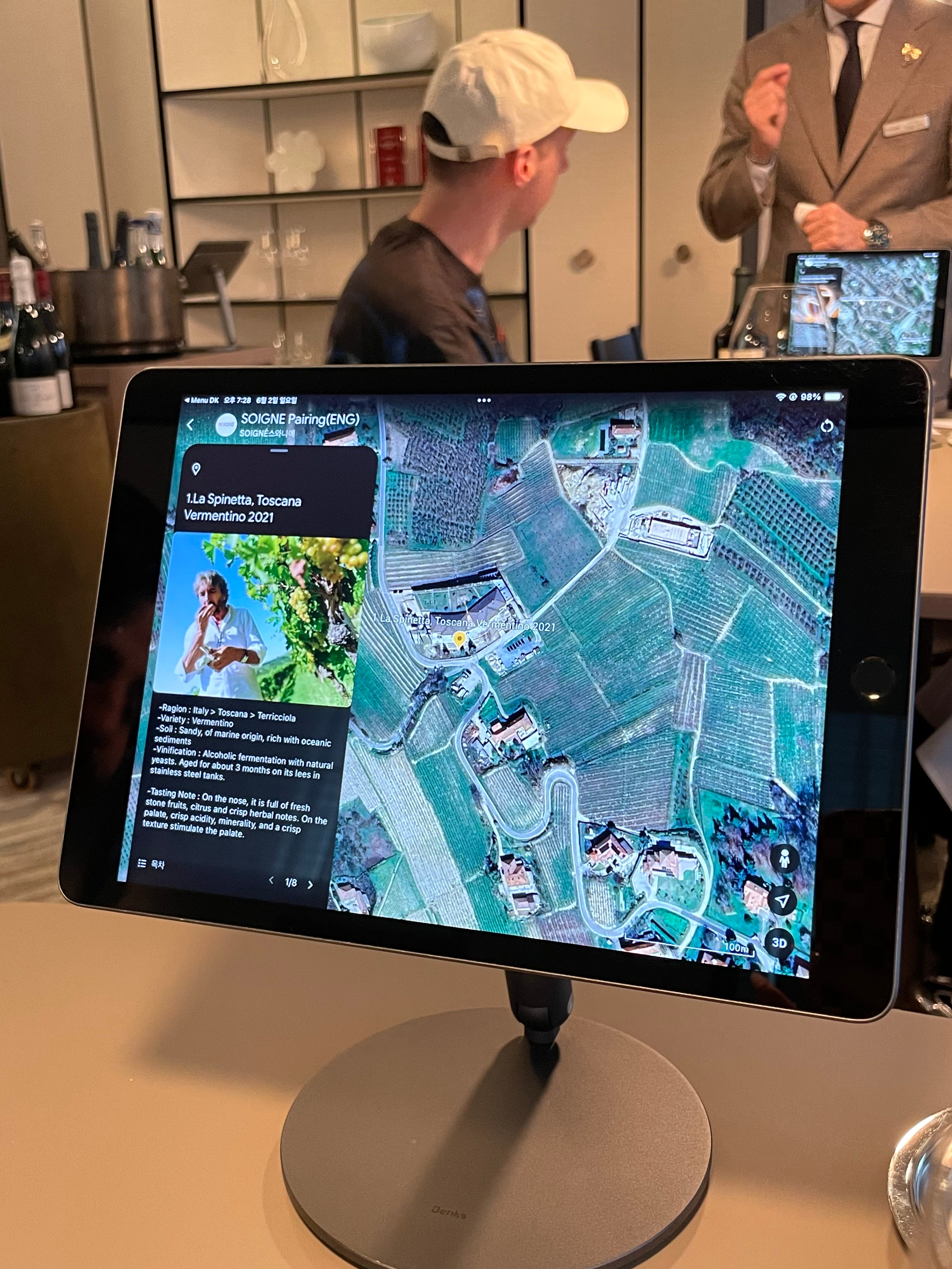 We were led to our table—of which there were fewer than ten—and pointed towards a tabletop iPad that contained interactive maps of where each wine we were about to drink came from. It all felt very futuristic.